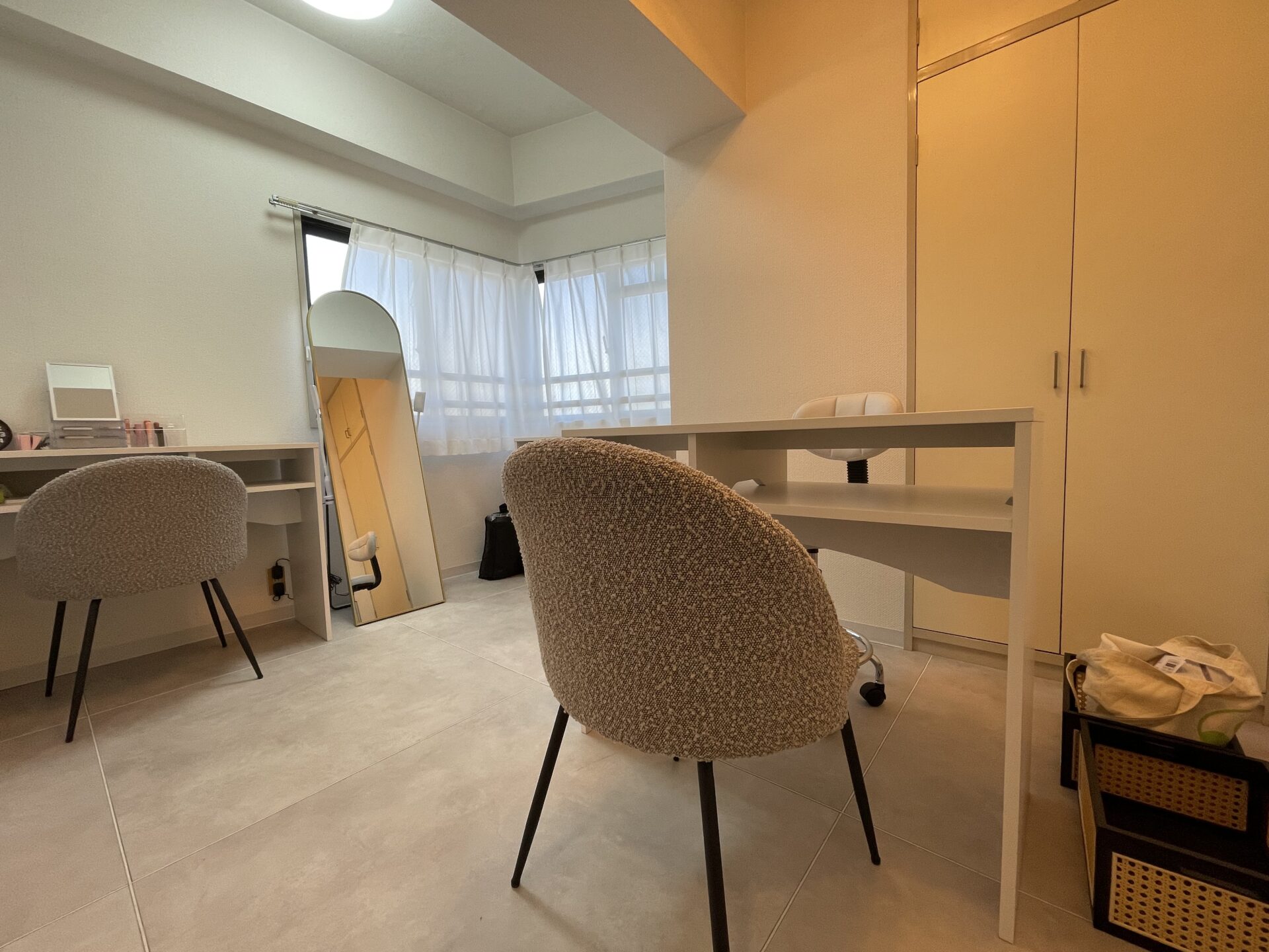 テーブル、ネイリストスツール、お客様チェア、ワゴン、荷物入れ